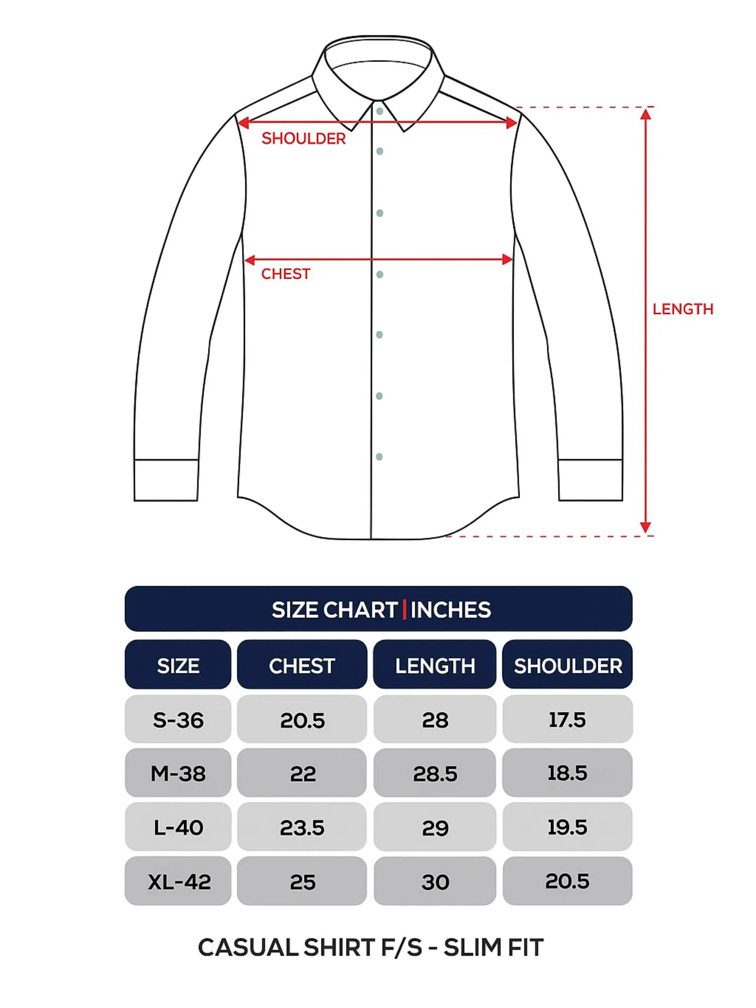 SIZE CHART — CASUAL SHIRT (SLIM FIT)