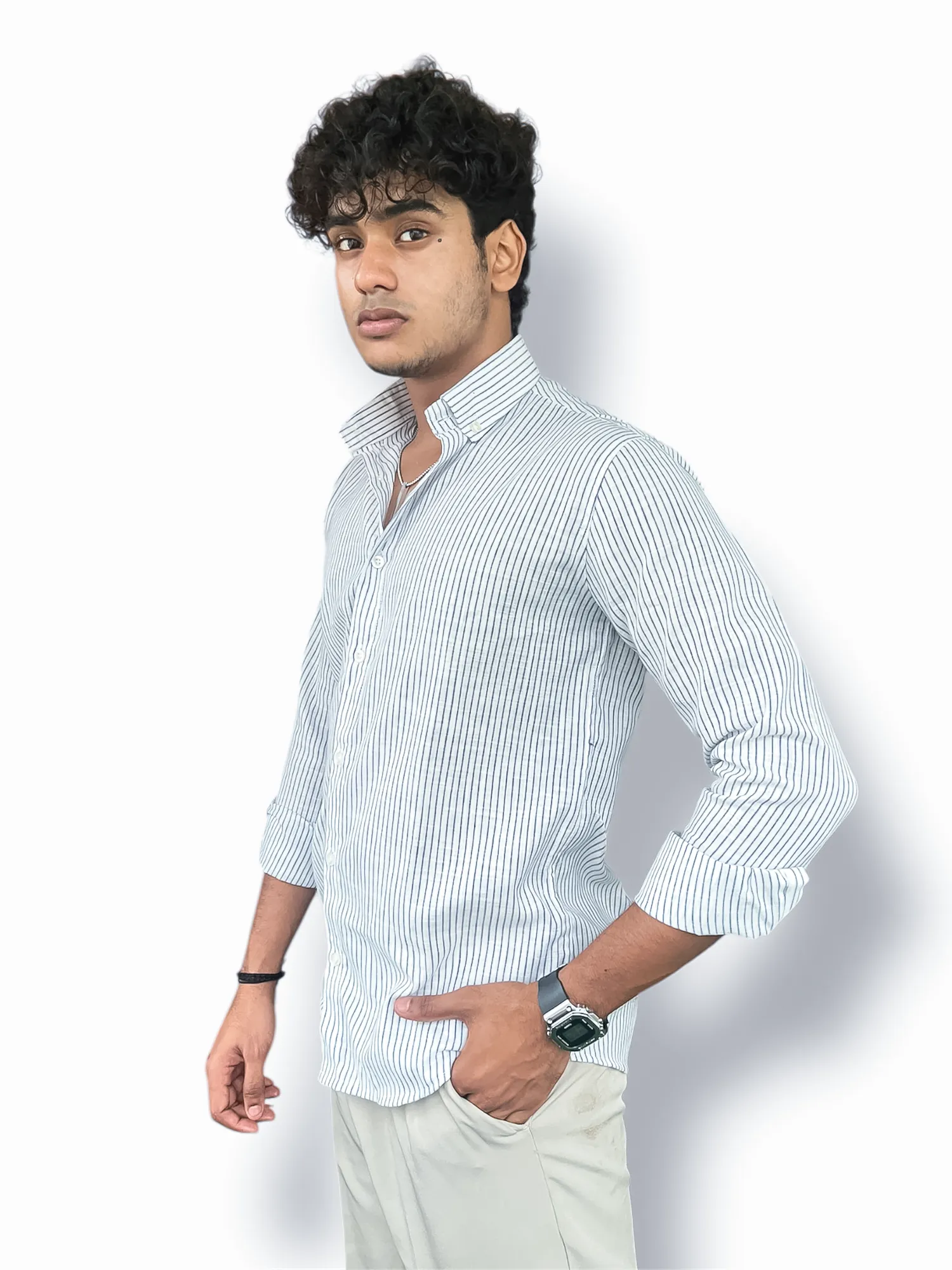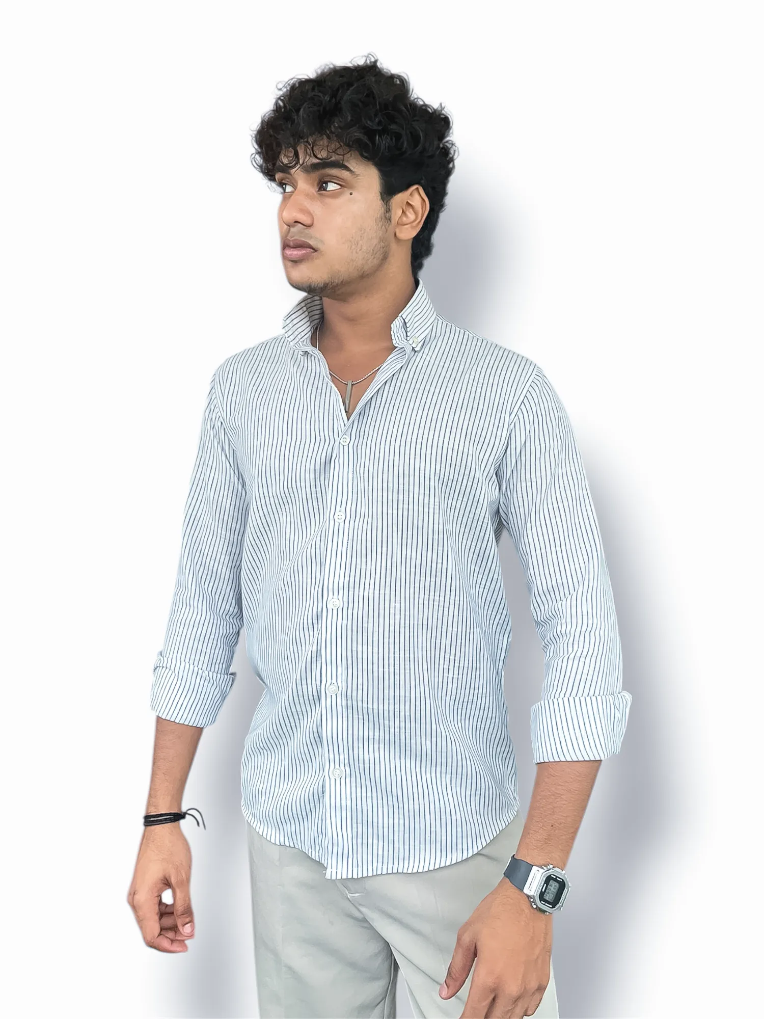 Premium Linen Full-Hand Shirt for Men – White & Blue Stripes (Slim Fit)